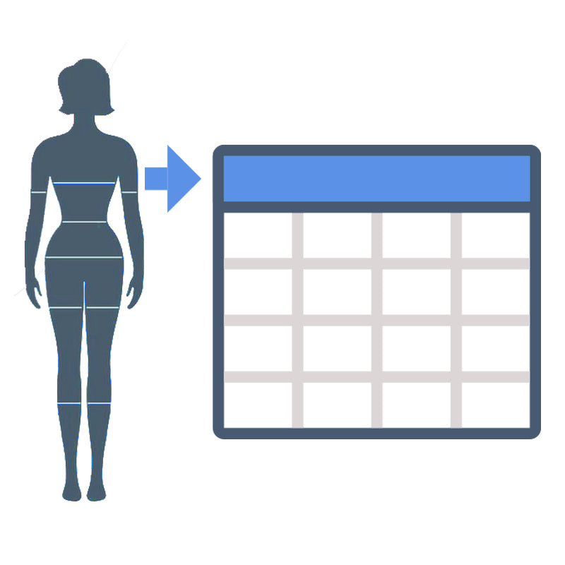 Poglej vodnikVodnik o tem, kako pravilno izmeriti svoje telo, kar je bistveno za uporabo kalkulatorja velikosti in preverjanje tabele velikosti. Pomembno za iskanje popolne velikosti.